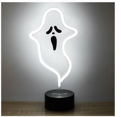 Decoratiune de Halloween, lampa de 3V, 0.06W, in forma de fantoma cu LED Neon, tub imprejur cu intensitate ridicata a luminii si durata lunga de viata. Functie de lumina statica, de culoare alba completeaza decorul de Halloween in cel mai bun mod. Functioneaza cu 3 baterii AA (nu sunt incluse).